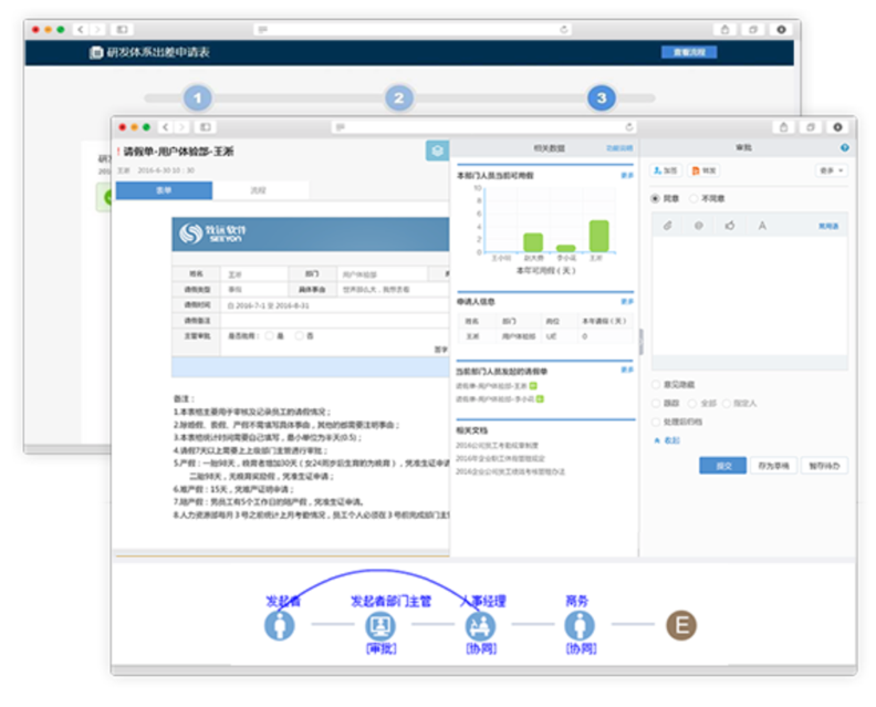 二元化工作流:实现刚性的制度与柔性的流程 相结合,实现快速审批。并且支持加签、减签、会签、知会、修改、 回退、撤销、终止、移交、转发、督办、关联、收藏、流程自动分 支、多条件分支策略,满足企业各种复杂流程处理状况。