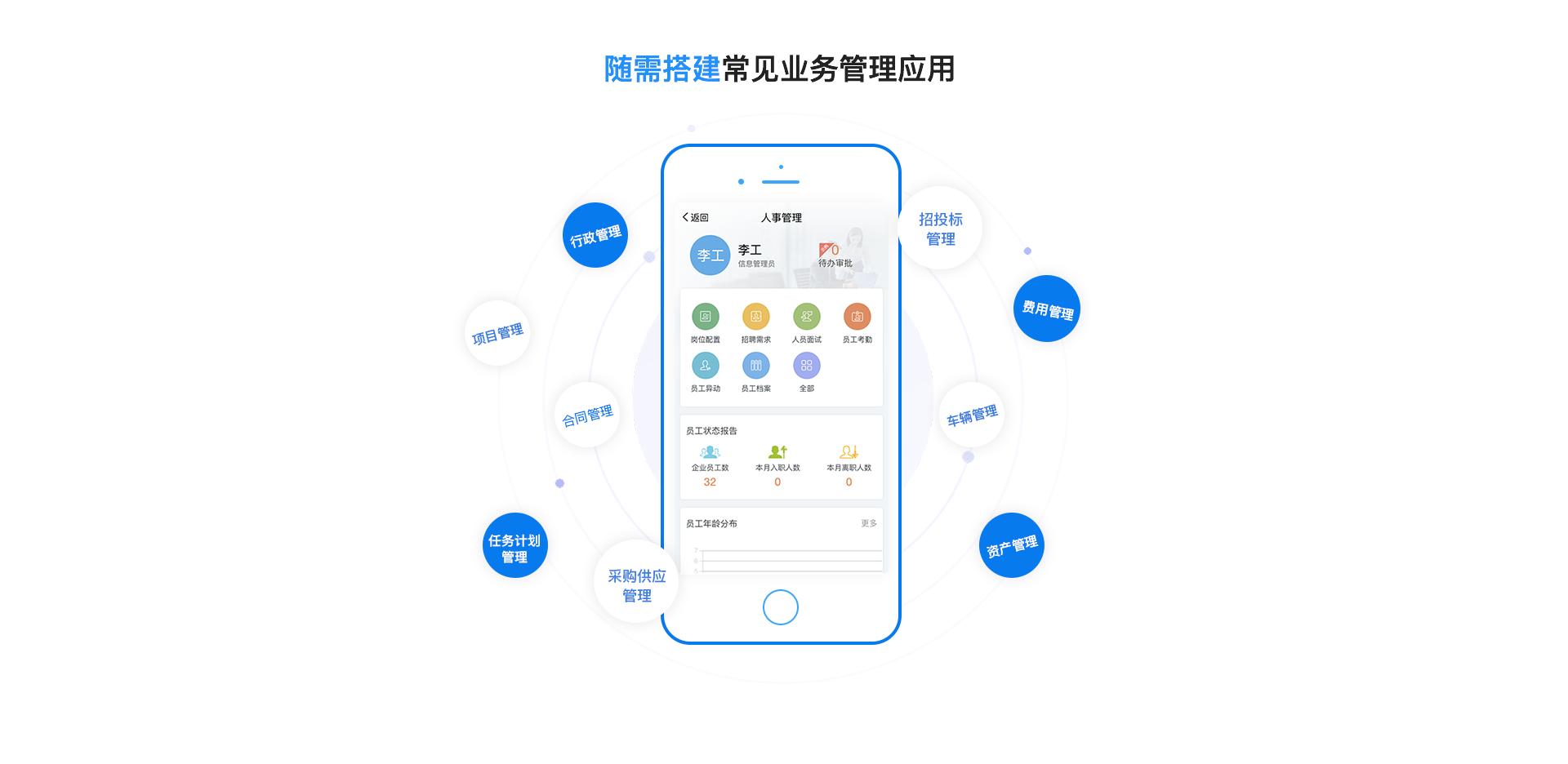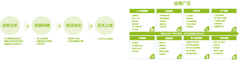 预置人事管理、合同管理、费用管理、客户管理、行政管理、资产管理、任务管理等业务应用包, 既可实现即装即用,又可根据企业的业务需求,随需定制