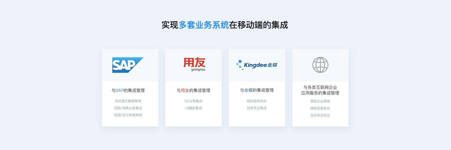 移动集成:支持第三方移动轻应用快速集成,并统一管理与用友NC、用友U8、畅捷通T+移动端集成,实现直接审批。
