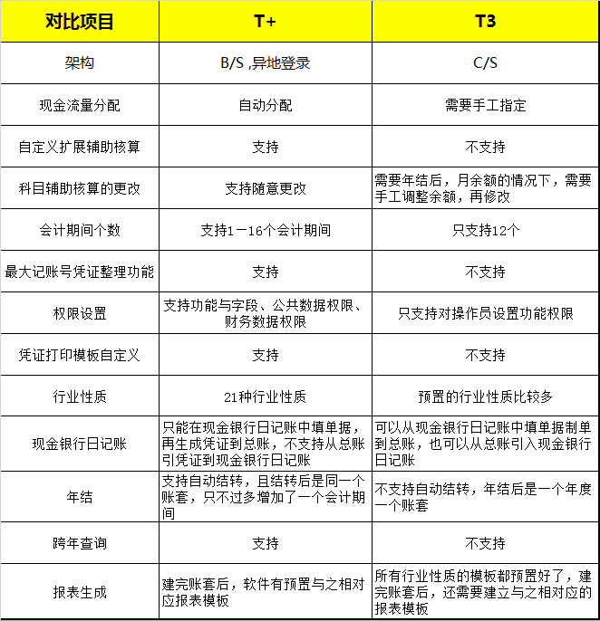 整体来说T+财务部分的自动化、便捷度、自由度更高,主要体现在现金流量的自动分配、自定义扩展辅助核算、更多可选的会计期间、权限管控更细化、出纳记账更方便,凭证打印格式更自由、记账结账更灵活、没有年结要求、跨年度账随时查询;而T3的普适性更强,预制的行业性质更多。